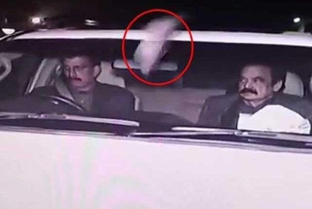 وفاقی وزیرداخلہ خوش قسمت رہے، گاڑی میں بیٹھے تھے ہوا میں تیرتا جوتا پہنچا نشانے پر مگر لگا ونڈ سکرین پہ ،فوری طور پر کوئی ہلچل نہ مچی مگر بعد میں سوشل میڈیا پر فوٹیج وائرل ہوگئی۔